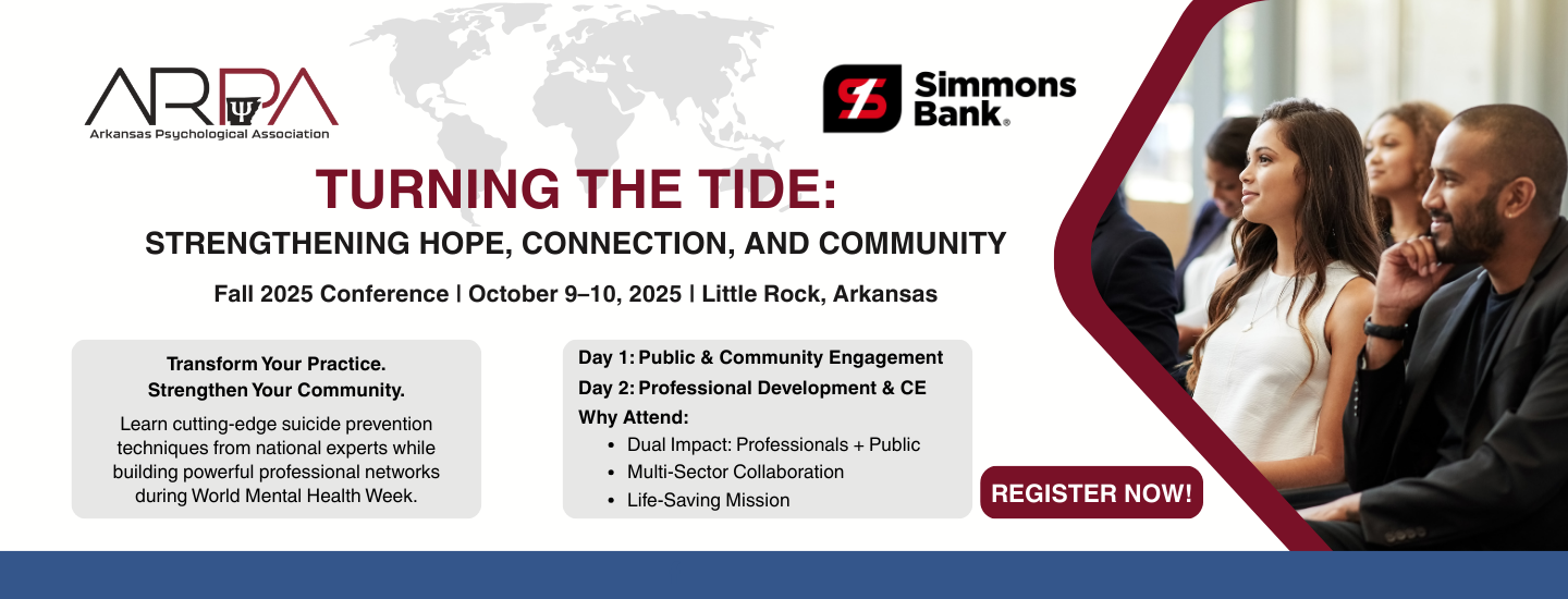 Little Rock, Arkansas, Sept. 25, 2025 (GLOBE NEWSWIRE) — The Arkansas Psychological Association (ArPA) will host its Fall 2025 Conference, “Turning the Tide: Strengthening Hope, Connection, and Community,” on October 9–10, 2025, in Little Rock, AR. This two-day hybrid event will bring together mental health professionals, students, advocates, and community members to address suicide prevention and expand access to mental health resources across Arkansas and beyond. While focused on Arkansas’s mental health landscape, the conference welcomes attendees from neighboring states and nationwide, particularly those interested in rural mental health challenges and evidence-based suicide prevention strategies.