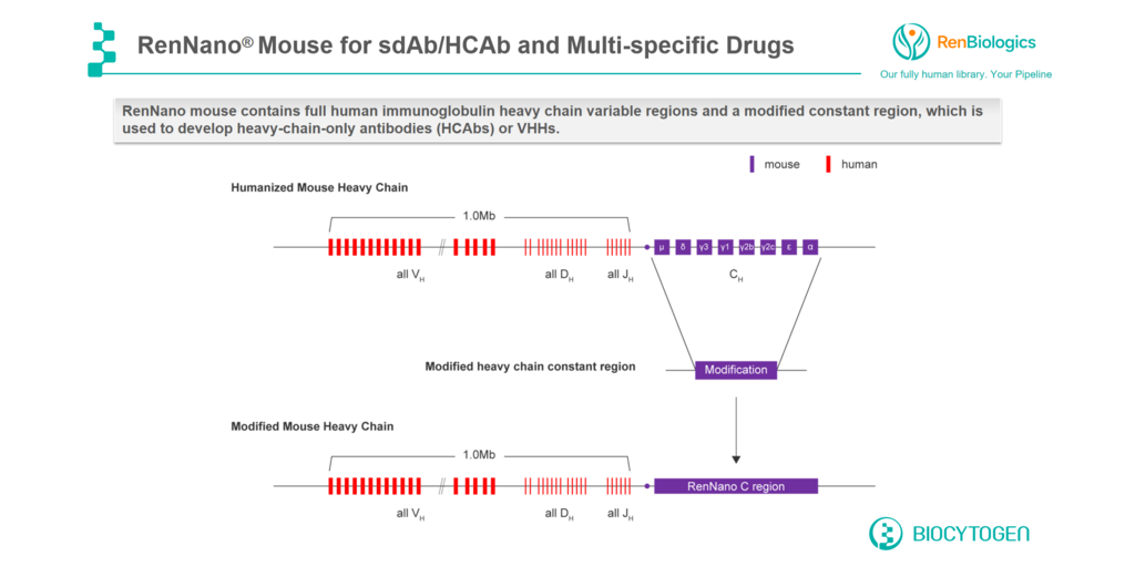 • Biocytogen RenNano® Platform: Uses large-fragment knock-in technology to replace mouse genes with over 120 human V genes in situ, resulting in a full and functional human heavy chain variable region genomic repertoire.