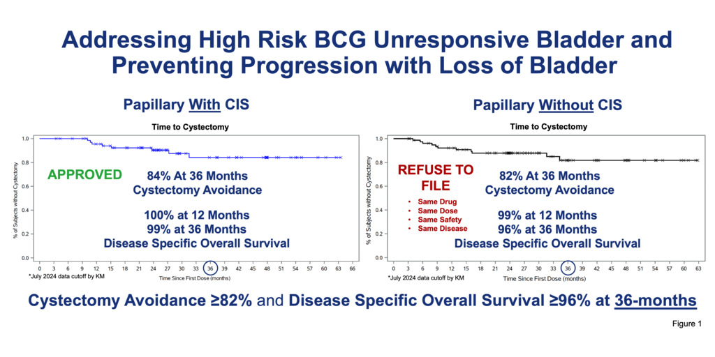 Cohort A (N=100) includes patients with histologically confirmed BCG-unresponsive NMIBC CIS with or without papillary disease. The primary endpoint is biopsy-confirmed complete response (CR) rate at any time. Secondary endpoints include duration of CR, progression-free survival (PFS), time to cystectomy, safety and overall survival. FDA Approved this indication in 2024 in which eligibility included patients with Papillary disease.