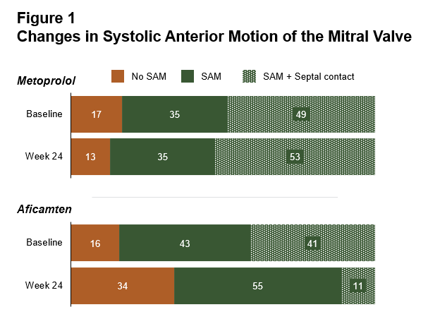 In addition to primary results of MAPLE-HCM presented by Dr. Garcia Pavia at the European Society of Cardiology Congress 2025, aficamten was also shown to be superior to metoprolol at improving measures of diastolic function and reducing the likelihood of mitral valve systolic anterior motion (SAM) and mitral valve leaflet-septal contact, the primary contributor to left ventricular outflow tract (LVOT) obstruction (Figure 1) (all p<0.001). There was a significant decrease in maximal wall thickness in patients treated with aficamten compared to those treated with metoprolol (treatment corrected difference = -1.01 mm [95% CI -1.8 to -0.2, p=0.015]) although the reduction in left ventricular mass index (LVMI) was not significantly different comparing aficamten to metoprolol. One (1.1%) patient treated with aficamten experienced transient left ventricular ejection fraction (LVEF) <50% without heart failure or treatment interruption. These data were simultaneously published in the Journal of the American College of Cardiology.1