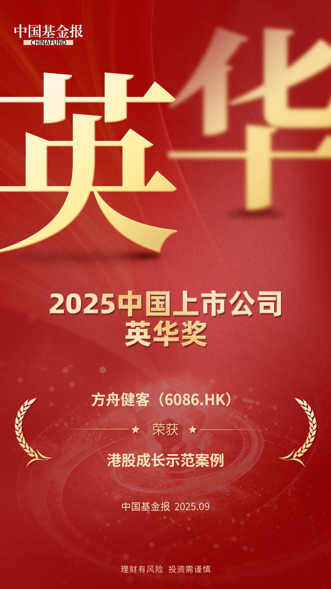 A red poster for the 2025 China Listed Company Yinghua Award. It shows that fangzhou won the "Hong Kong Stock Growth Demonstration Case
