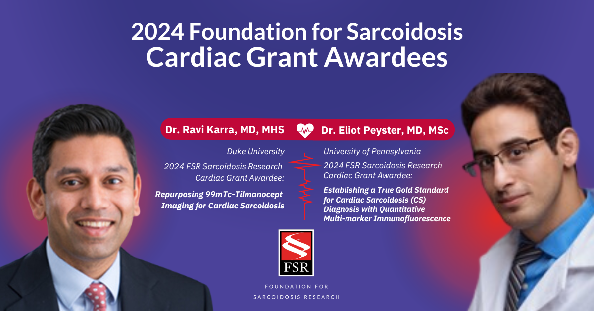 FSR has awarded two grants, each in the amount of $100,000, to Dr. Eliot Peyster, MD, MSc, Assistant Professor of Medicine at the University of Pennsylvania, and Dr. Ravi Karra, MD, MHS, Associate Professor of Medicine and Pathology at Duke University. These grants support innovative projects designed to improve diagnostic accuracy and clinical care for cardiac sarcoidosis patients.
