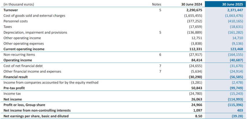 Sales amounted to €1,923 million, down 2% from end-June 2024 and EBITDA stood at €149 million, with margin improvement to 7.8% (+110bps) due to a positive mix effect.