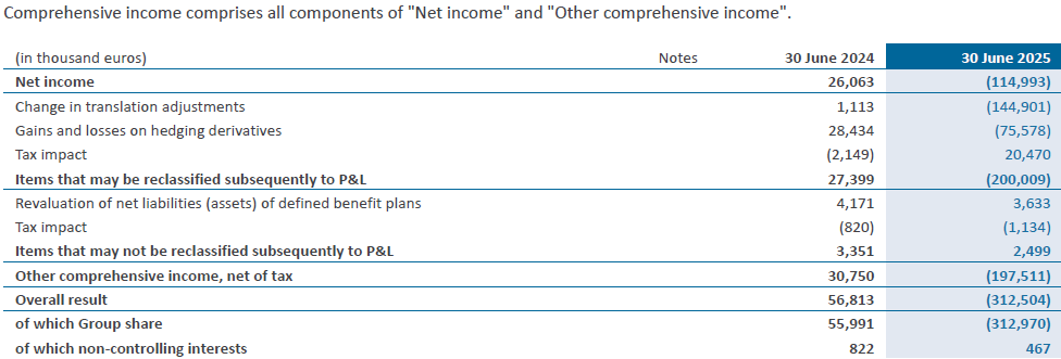 The reported net result for the period was -€115 million, compared to €26 million at end of June 2024. This decline mainly reflects: