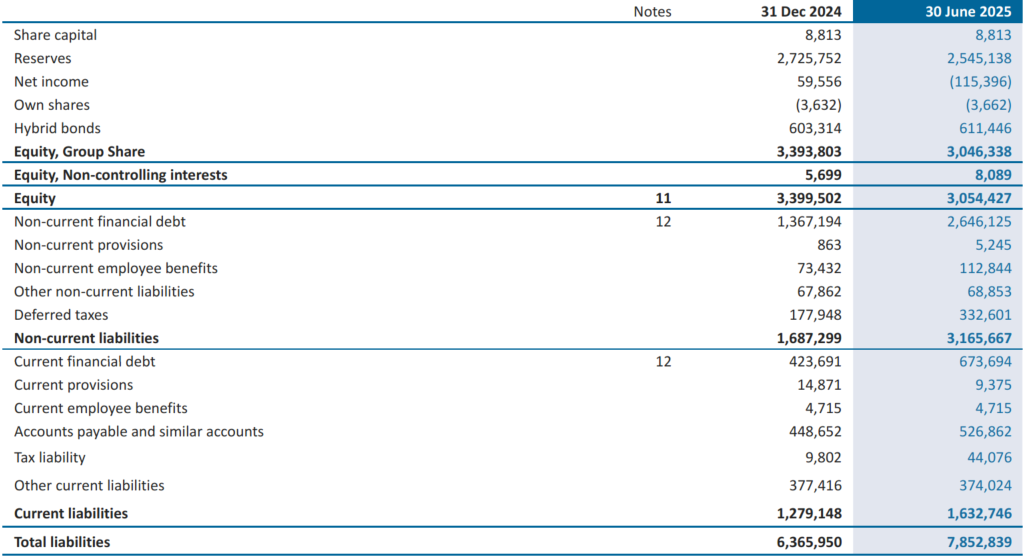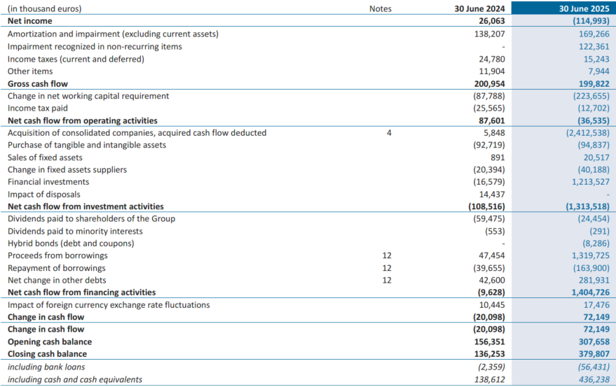 The cost of net financial debt amounted to €32 million, up from €25 million at end of June 2024. This increase was expected as it reflected the higher debt volume following the acquisition in May 2025. This was partially offset by lower interest rates as well as by the interest income collected on the €1.2 billion deposit initiated after the inaugural bond issuance in November 2024 until the acquisition.