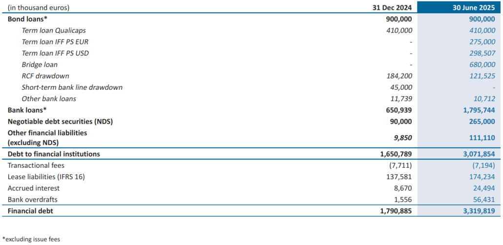 At end of June 2025, the Group’s net financial debt rose to €2,854 million, compared with €237 million at end-December 2024. This level reflects the anticipated impact of the IFF Pharma Solutions acquisition completed in May 2025.