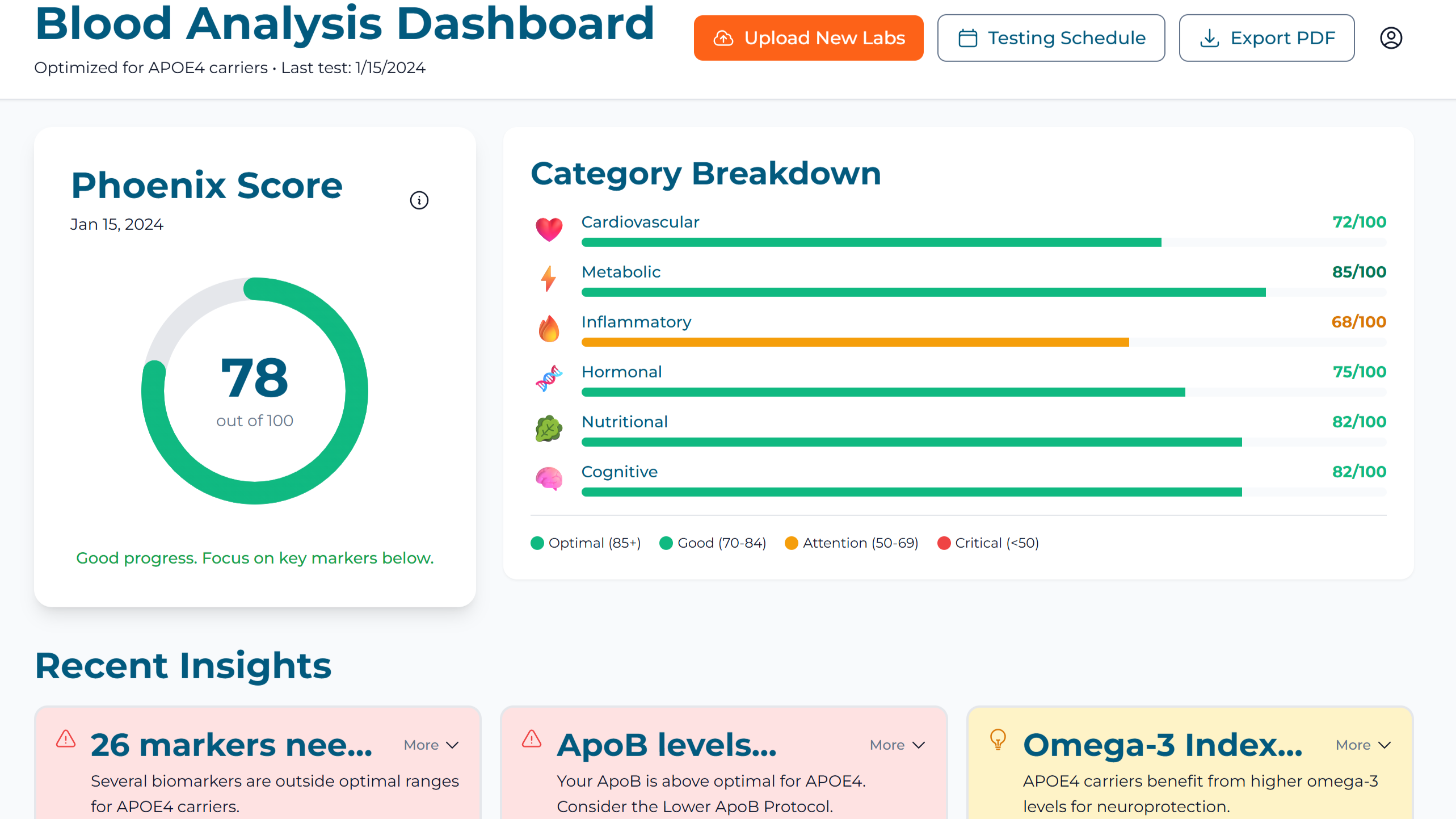APOE4-Specific Blood Analysis: The Phoenix Score analyzes 50+ biomarkers with APOE4-optimized ranges and discovers hidden risks. Example: While standard ApoB shows “normal,” APOE4 carriers need levels below 70 mg/dL. The dashboard provides specific action steps.