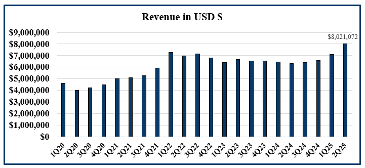 - Q2 2025 revenues of $8,021,072 increased by 13.1% relative to Q1 2025 revenues of $7,093,624 and 26.5% relative to Q2 2024 revenues of $6,338,532.